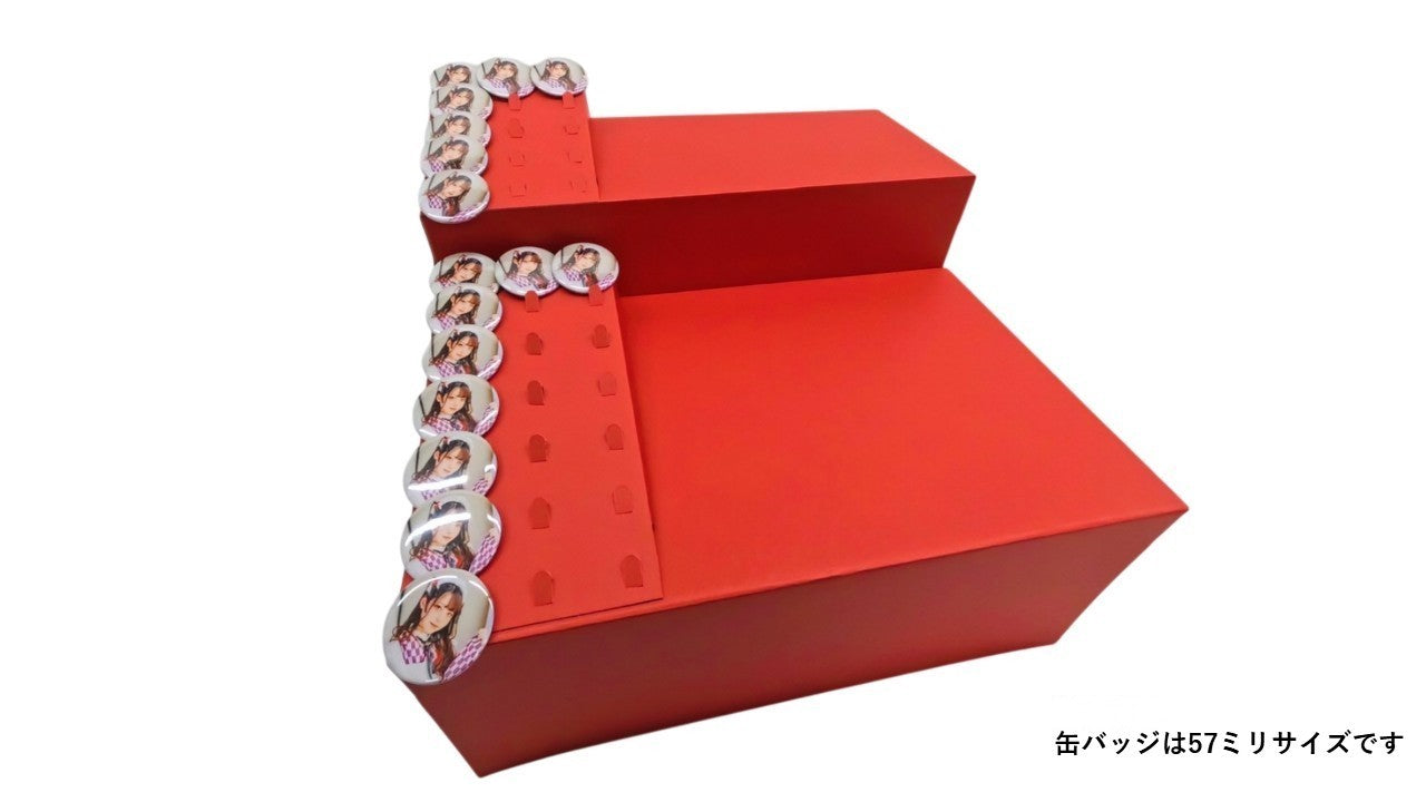 上段には缶バッジ台座 小(5列×2個)、下段には缶バッジ台座 大(5列×2個)を使用することで、57ミリ缶バッジが120個ピッタリ収まる設計です。